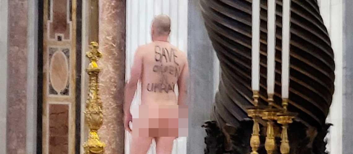 CIUDAD DEL VATICANO.- Un hombre saltó este jueves hasta el altar principal de la Basílica de San Pedro, en el Vaticano, y se desnudó para mostrar unas pinturas en su cuerpo contra la guerra de Ucrania.