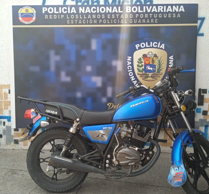 De igual manera, los funcionarios de la Estación Policial «Guanare» lograron recuperar en la vía hacia Guanarito, una moto tipo paseo, marca Bera, modelo León, color azul, año 2022, placas AV6W35W, que estaba solicitada por parte del Eje de Investigación de Hurto y Robo de Vehículos Portuguesa, por el delito de robo de vehículo automotor.