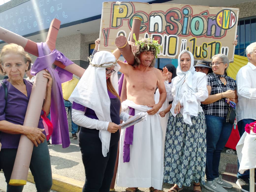 ACARIGUA.- Con 15  estaciones frente a diversas dependencias públicas como Fiscalía, Alcaldía de Páez, Cantv, Corpoelec, entre otros organismos, trabajadores activos y jubilados de la administración pública y sociedad civil realizaron un Vía Crucis para revivir el calvario que vivió Jesús de camino a la cruz y denunciar el padecimiento que hoy en día viven los venezolanos por la pérdida del poder adquisitivo por los bajos salarios y la pérdida de beneficios laborales.
